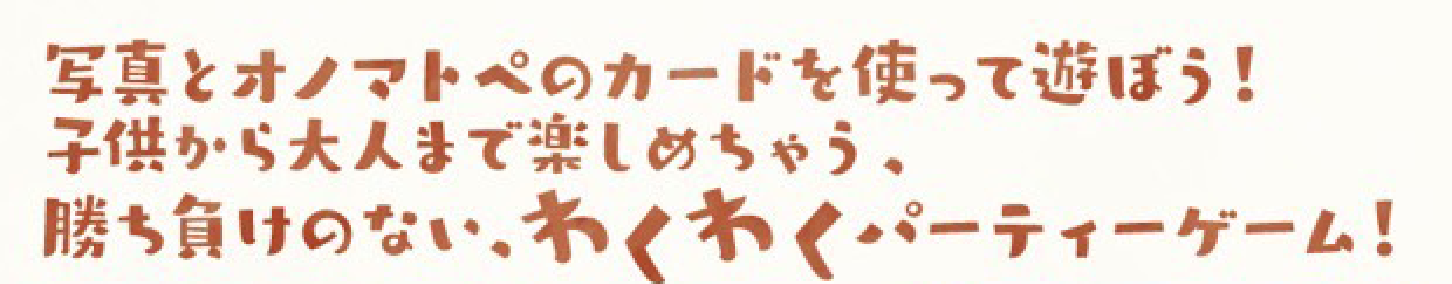 「フォトマトペ」は、そんな「フォト」と「オノマトペ」のカードを使い、 声を出し合いながら遊ぶボードゲームです。難しい言葉も知識も一切必要ないので、 こどもから大人まで老若男女楽しめます。大事なのは誰もが持ってるひとりひとりの感性で、 勝ち負けもありません。